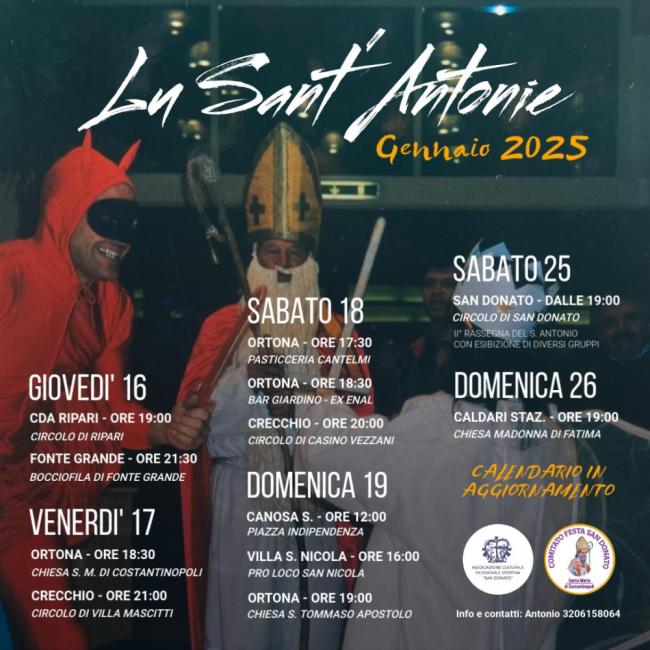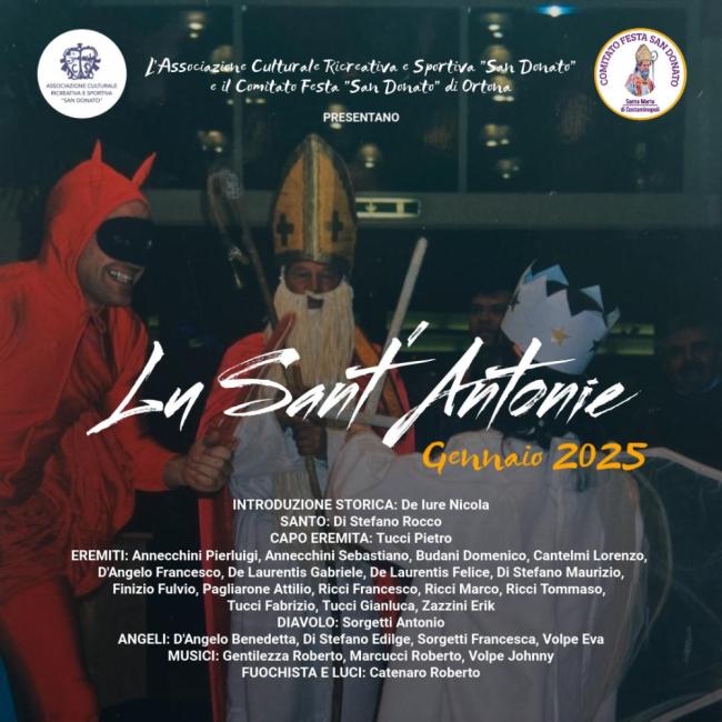 L’Associazione Culturale Ricreativa e Sportiva “San Donato” e il Comitato Feste “San Donato” presentano, anche quest’anno, la tradizionale rappresentazione del Sant’Antonio realizzata dalla nostra contrada: nelle immagini di seguito troverete i protagonisti e il calendario, in continuo aggiornamento, con tutte le uscite attualmente confermate!