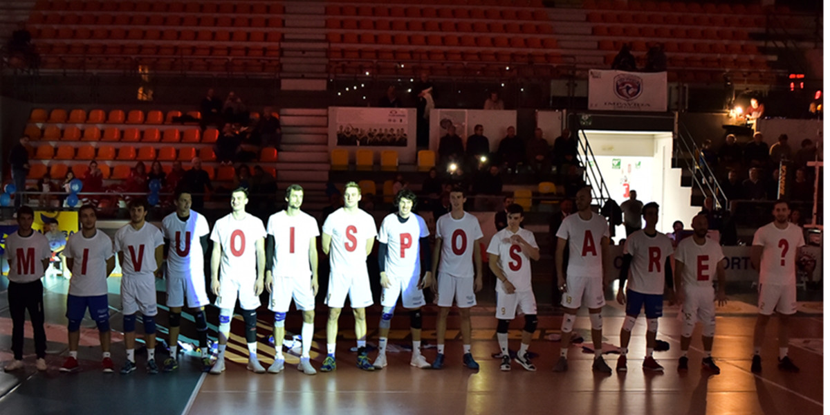Ma in una serata così buia c’è almeno qualcosa che brilla: Giulia ha detto Si. Ha detto si alla proposta di matrimonio da parte del centralone Michele Simoni che è arrivata a sorpresa proprio qualche minuto prima dell’inizio della gara. Le luci si spengono e sulle maglie dei giocatori ortonesi si compone la scritta: “Mi vuoi Sposare?” e Giulia ha risposto … si! Tanti auguri a Giulia e Michele per una lunga vita insieme. Che possa essere costellata di serenità e successi.