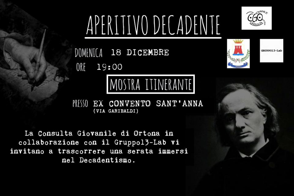 La Consulta Giovanile di Ortona, in collaborazione con il Gruppo-13lab, organizza nel pomeriggio di domenica 18 dicembre dalle ore 19 l'Aperitivo Decadente. Un percorso all'interno del chiostro di Sant'Anna per ricreare attraverso suoni, immagini, poesie e odori la cultura decadente di metà ottocento. Tutta la cittadinanza è invitata a partecipare all'evento.