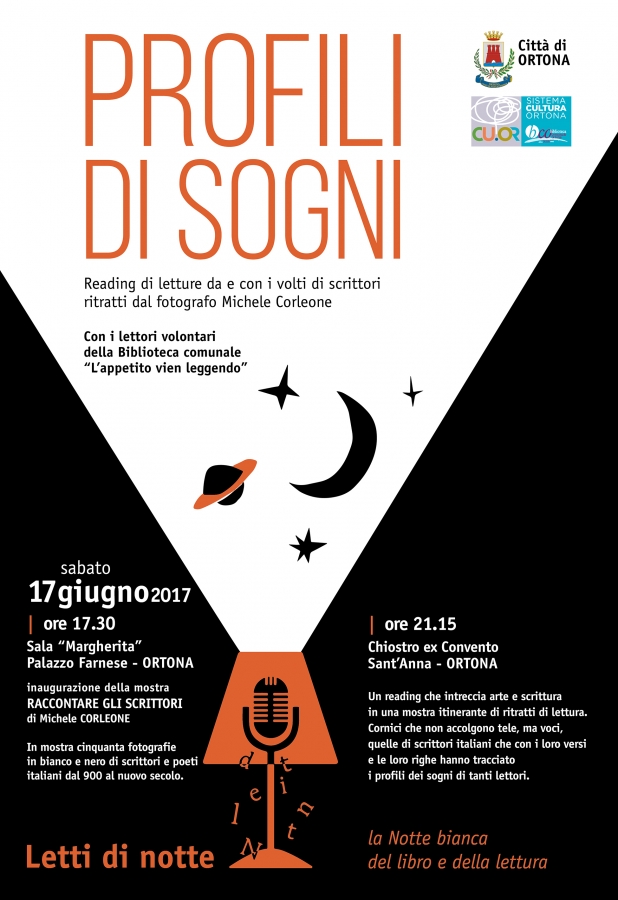 Si tratta di 50 fotografie che ritraggono scrittori e poeti contemporanei, caratterizzate da inquadrature a grandangolo, giochi di sfocature e movimento, geometrie e contrasti, tutto in un rigoroso e denso bianco e nero. Una vera e propria raccolta documentale che rappresenta una parte dell’ampia ricerca iniziata da Corleone nei primi anni ’90 e arricchita per mostrare le personalità che meglio hanno espresso ed esprimono il fare versi e lo scrivere. Un filo ideale che partendo dalle immagini in mostra giungerà la sera, nel chiostro di S. Anna, a dar voce agli scrittori che con i loro versi e i loro testi hanno tracciato i profili di sogni di tanti lettori. Ad interpretare i passi scelti nella notte bianca della lettura, saranno i lettori volontari del gruppo “L’Appetito vien Leggendo” Giulia Di Medio, Pamela Ferrante, Paola Mantini, Barbara Nervegna, Anna Maria Costanzo, Mariella Fileni, Sara Simone.