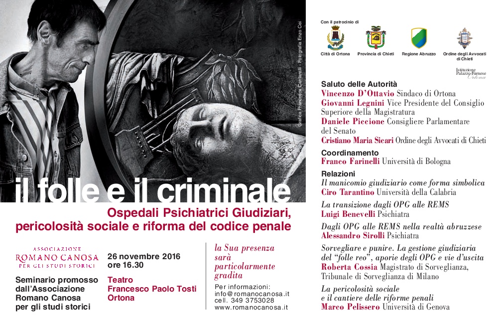 L'Associazione Romano Canosa per gli studi storici ispirandosi al volume "Storia del manicomio in Italia dall'Unità ad oggi" (Feltrinelli) di R. Canosa organizza il convegno "Il folle e il criminale. Ospedali psichiatrici giudiziari (opg) Pericolosità sociale e riforma del codice penale" il 26 novembre alle ore 16,30 al Teatro F.P.Tosti ad Ortona.