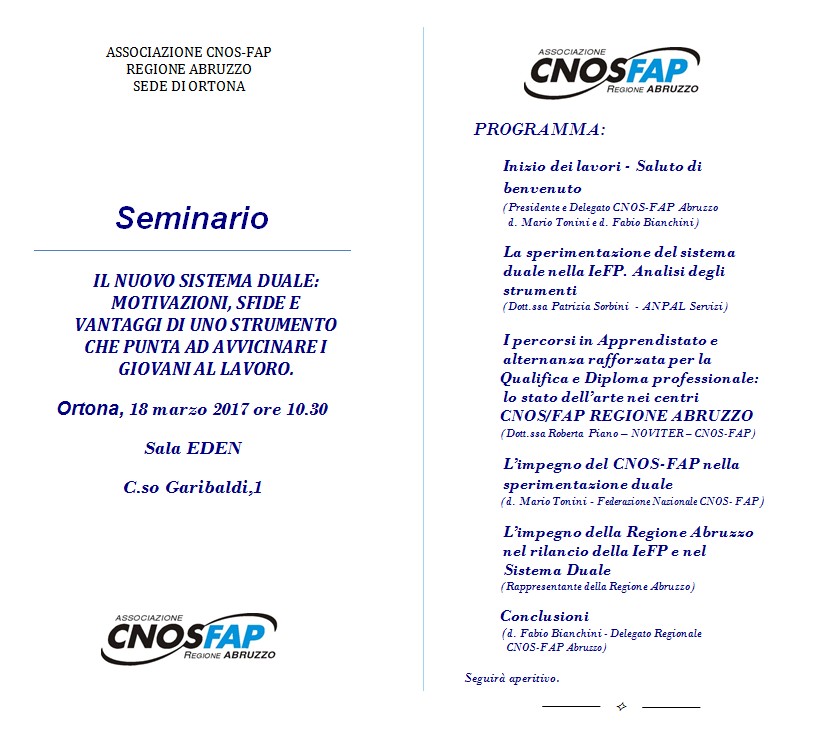 Organizzato dall'associazione CNOS-FAP Regione Abruzzo, il centro di formazione professionale salesiano di Ortona, presso la sala Eden in data sabato 18 marzo alle ore 10:30.