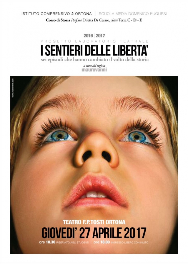 Il progetto che verrà presentato il giorno 27 aprile presso il Teatro F.P.Tosti di Ortona alle ore 18, prevede la realizzazione di un cortometraggio e di un spettacolo in scena, nel quale i ragazzi racconteranno in una chiave del tutto inedita sei avvenimenti storici, legati al tema della conquista della Libertà .