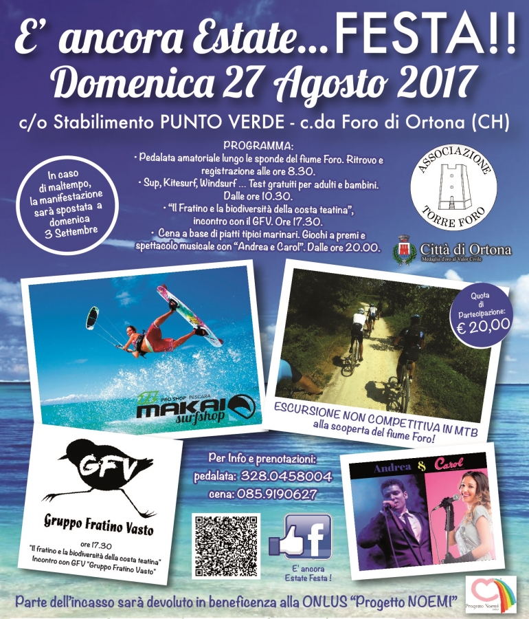 L’Associazione Torre Foro, domenica 27 agosto, organizzerà la seconda edizione di “E’ ancora Estate … Festa!” presso lo stabilimento Punto Verde in contrada Foro di Ortona.
