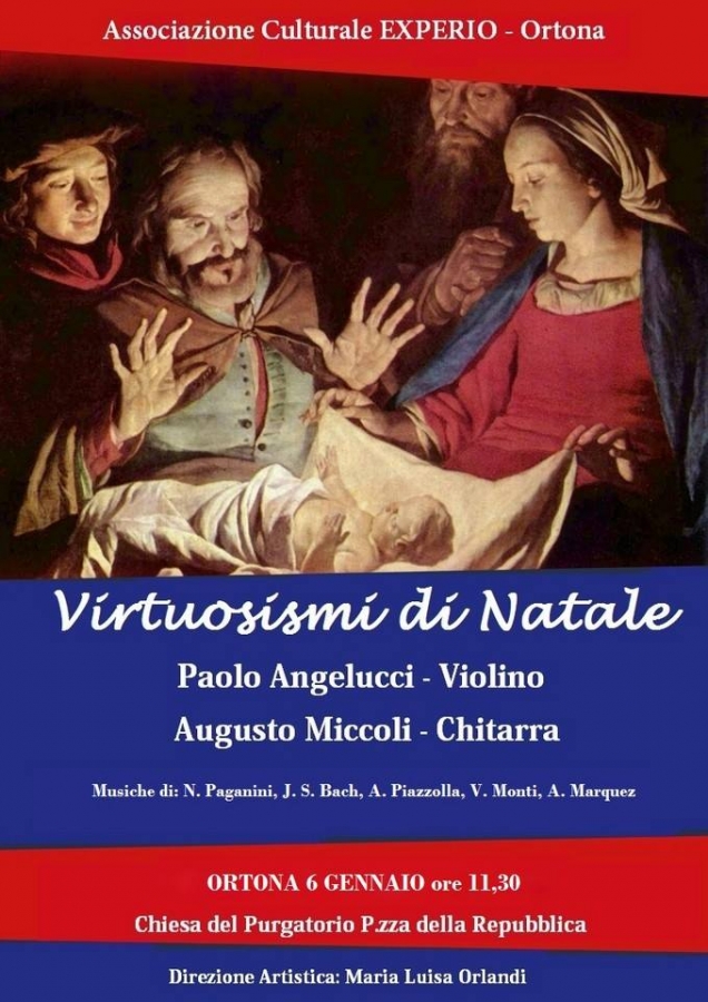 Venerdì 6 gennaio alle ore 11,30 alla chiesetta del purgatorio di P.zza della Repubblica si terrà il tradizionale concerto VIRTUOSISMI DI NATALE a cura dell'Associazione Culturale EXPERIO con Paolo Angelucci al violino e Augusto Miccoli alla chitarra. Direzione artistica della Prof.ssa Maria Luisa Orlandi