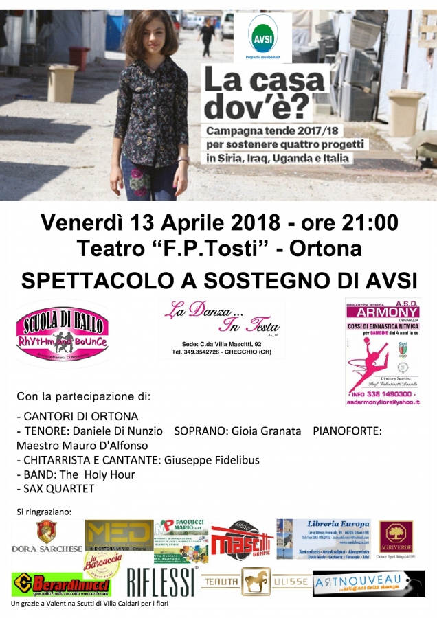 Venerdì 13 Aprile ad Ortona presso il Teatro F. P. Tosti alle ore 21 ci sarà uno spettacolo di beneficenza che prevede un alternarsi di esibizioni canore e di balli.