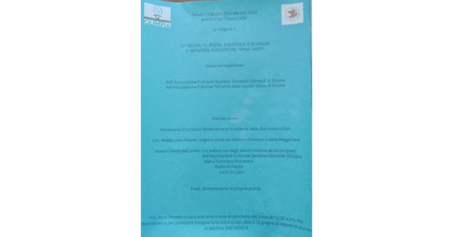 Sabato 15 Giugno ore 18,00 al Bar “ Pausa Caffe’” in Via Tommaso Berardi, Ortona il 12° Recital di Poesia dialettale e in lingua e il 5° Memorial dedicato a Anna Basti