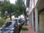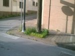 Proseguendo su Via Roma, si vede il muro dell chiesa invaso dalle erbacce e le piccole aiuole attorno agli alberi, infestate dalla solita erba.
