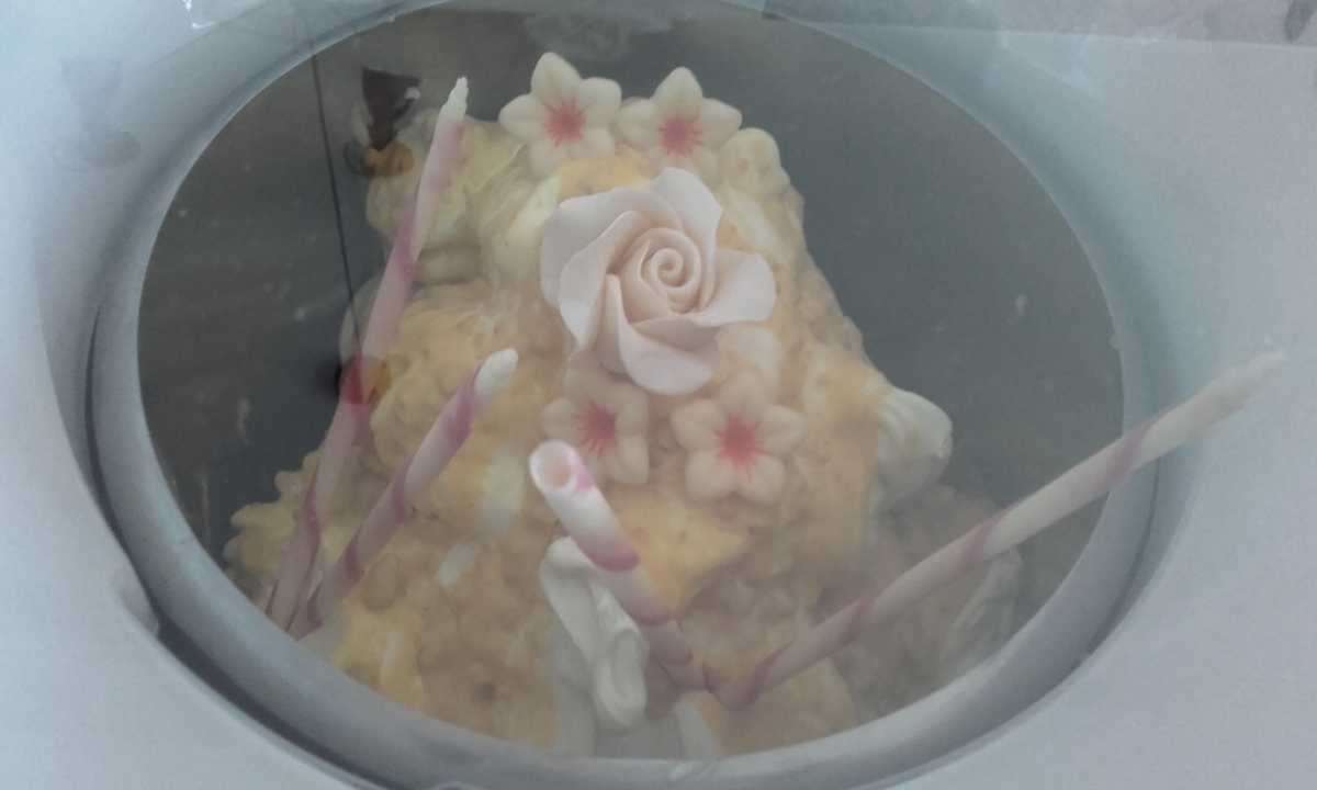 La cena è allestita sulla falsariga della pausa pranzo, attorniata da una nutrita varietà di gelati.