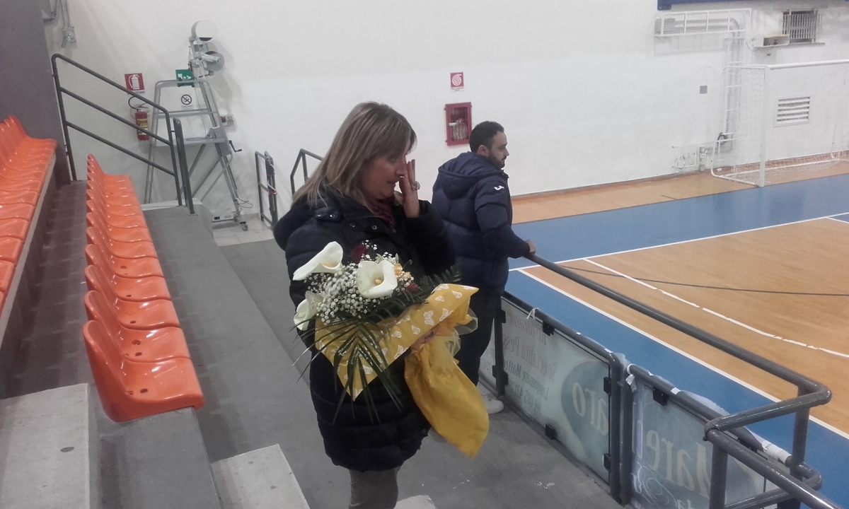 Pochi istanti prima della gara, il capitano della Tombesi calcio a 5 Alessio Rossi consegna all'assessore allo Sport Simonetta Schiazza un gentile omaggio floreale a nome della società, della squadra e della tifoseria ortonese.