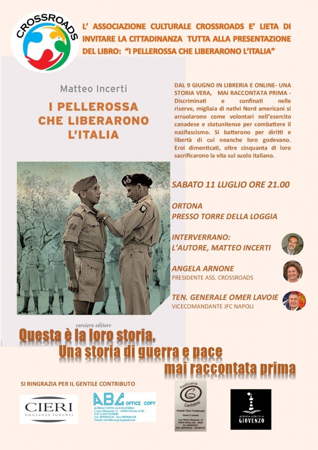 Nella splendida cornice di Torre Della Loggia, l'associazione Crossroads è lieta di invitare tutta la cittadinanza alla presentazione del libro " I Pellerossa che liberarono l'Italia". L'evento si terrà sabato 11 luglio dalle 21.00. Interverranno l'autore del libro Matteo Incerti, Angela Arnone Presidente dell'Associazione Crossroads ed il Tenente Generale Omer Lavoie, Vice Comandante JFC Napoli.