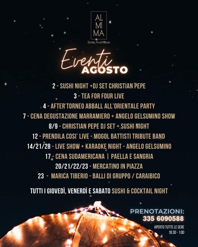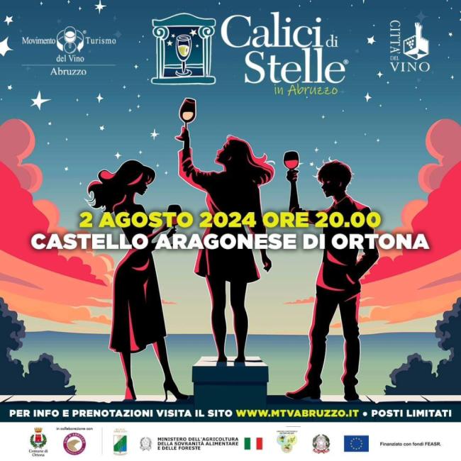 La manifestazione non è una cena, non c’è prenotazione di tavoli e/o posti a sedere, e tutta la proposta gastronomica è pensata per essere mangiata in versione “finger food”, Si raccomandiamo di portare coperte per godervi la serata sul prato interno del Castello Aragonese. Il contributo per la partecipazione alla serata è di 40€ a persona e non sono previsti menu o altre soluzioni per bambini (Calici di Stelle si rivolge a un pubblico adulto) o variazioni personali diverse dalla segnalazione di celiachia al momento della prenotazione.
