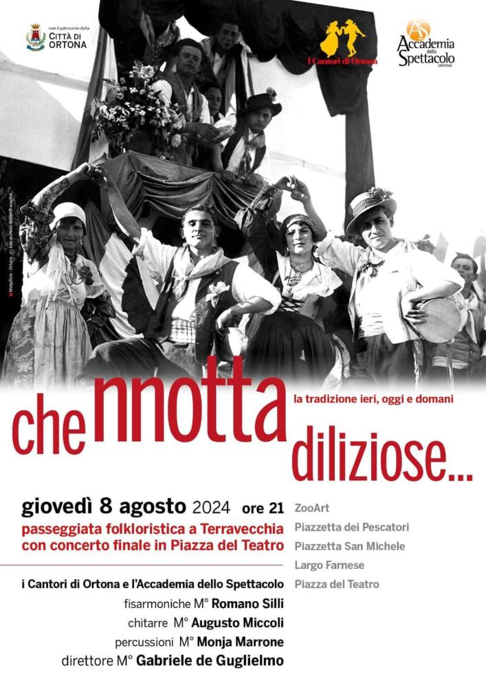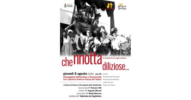 Giovedì 8 alle 21 da Zooart partirà la passeggiata folkloristica a Terravecchia con concerto finale in Piazza del Teatro, a cura dei Cantori di Ortona e dell’Accademia dello Spettacolo, da anni un appuntamento immancabile dell’estate ortonese, con musiche e costumi tradizionali