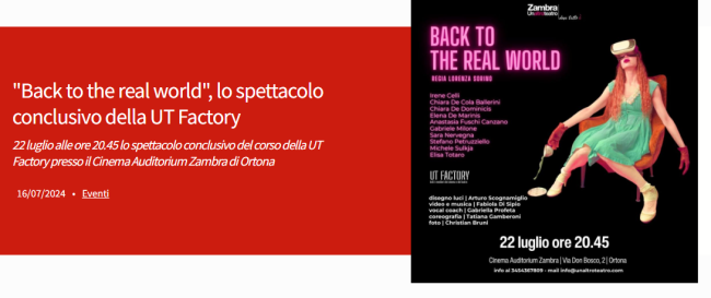 22 luglio alle ore 20.45 lo spettacolo conclusivo del corso della UT Factory presso il Cinema Auditorium Zambra di Ortona