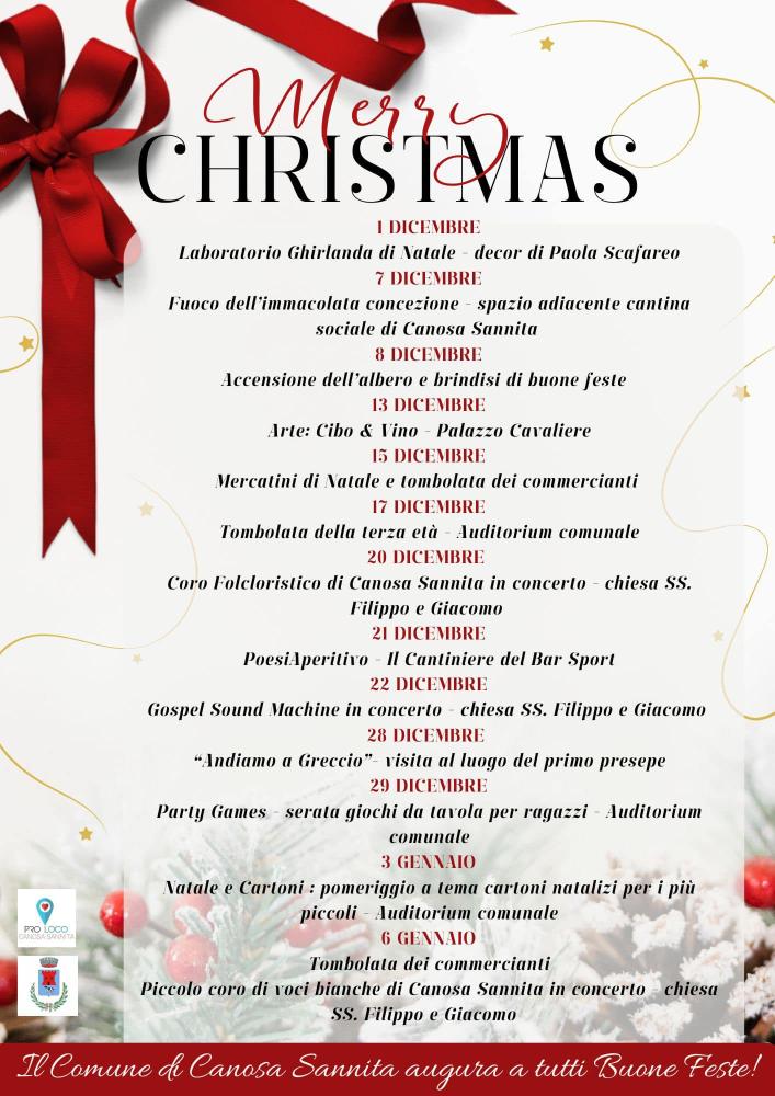 Un ricco programma che si articola per tutto il mese di dicembre fino agli ultimi appuntamenti previsti per il giorno dell’Epifania. Il Comune di Canosa Sannita, in collaborazione con la Pro loco del paese, ha reso noto il cartellone degli eventi natalizi. Tredici date complessive per iniziative laboratoriali, ludiche, culturali ed enogastronomiche che coinvolgono commercianti, associazioni e varie realtà del territorio. Dopo un primissimo appuntamento che si è tenuto domenica scorsa, con un pomeriggio all’insegna della creatività grazie al laboratorio di ghirlande di Natale che ha immerso i partecipanti nel clima natalizio, da sabato si entrerà nel vivo degli eventi. Nello spazio antistante la cantina sociale, infatti, a partire dalle ore 18 verrà acceso il tradizionale fuoco dell’Immacolata Concezione. Il giorno successivo, invece, ci sarà un brindisi di buone feste in centro.