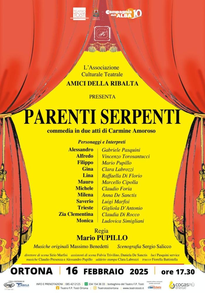 La rappresentazione celebra il forte legame tra i luoghi storici abruzzesi: infatti, il meraviglioso centro storico di Sulmona venne scelto dal regista Monicelli per girare il film, dopo attenti sopralluoghi che lo portarono a preferire questa location a Lanciano. Una decisione che ha contribuito a rendere immortali le atmosfere del capolavoro cinematografico. "Parenti Serpenti" è anche un omaggio alle tradizioni natalizie abruzzesi, tra cui la suggestiva ricorrenza de "La Squilla", il vero cuore del Natale lancianese, celebrata ogni anno il 23 dicembre. Lo spettacolo nel 2024 ha rappresentato la Regione Abruzzo al Festival FITA (Federazione Italiana Teatro Amatoriale) di Galatina, riscuotendo un notevole successo.