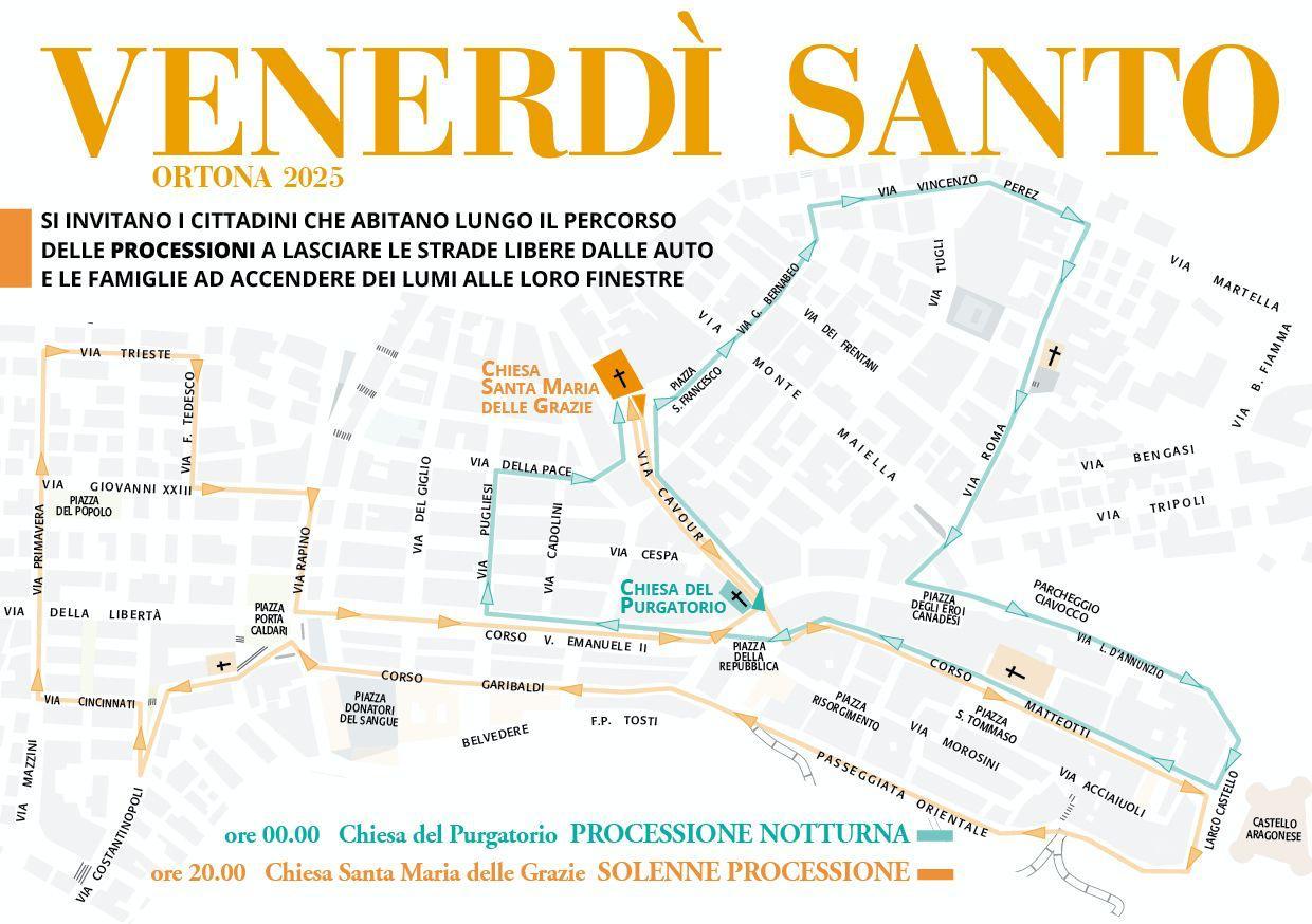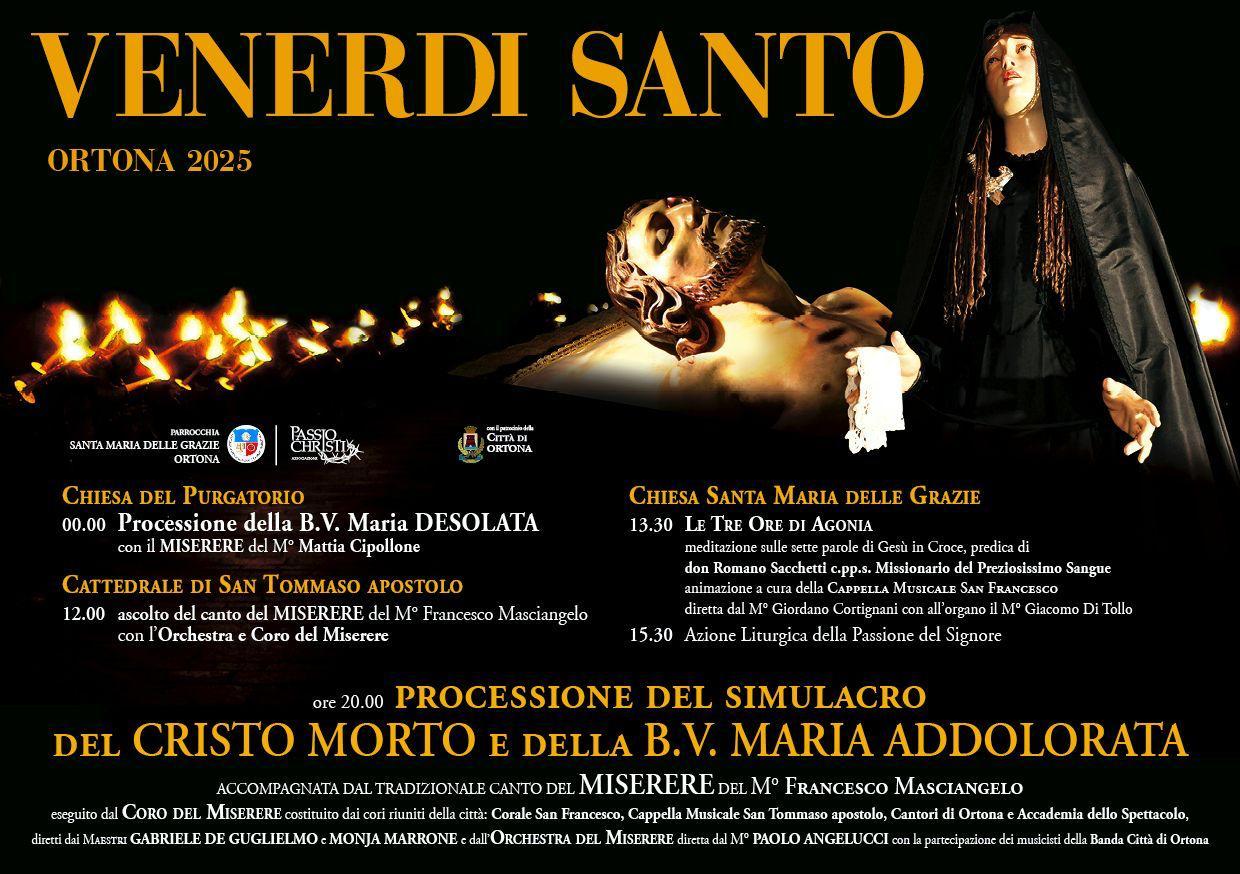 Venerdì santo alle ore 12 Ascolto del Miserere nella cattedrale di san Tommaso Apostolo. Alle 13.30 invece nella parrocchia di Santa Maria delle Grazie Le Tre ore di agonia, predicatore don Romano Sacchetti missionario del preziosissimo sangue, alle 15.30 celebrazione della passione del Signore.