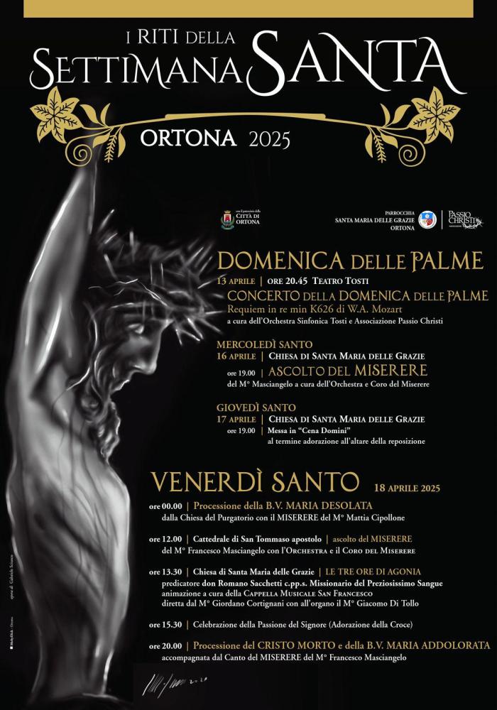 Gli appuntamenti prenderanno il via domenica 13 aprile, al Teatro Tosti, alle 20.45, con il concerto della Domenica delle Palme "Requiem in re minore K626 " di W.A. Mozart a cura dell'Orchestra Sinfonica Tosti e dell' Associazione Passio Christi, si prosegue mercoledì santo, 16 aprile, nella chiesa di Santa Maria delle Grazie, alle ore 19, con l'ascolto del Miserere del M° Masciangelo a cura dell'Orchestra e del Coro del Miserere. Giovedì santo nella Chiesa di Santa Maria delle Grazie alle 19 Messa in cena Domini al termine Adorazione all'altare della reposizione con un momento musicale.