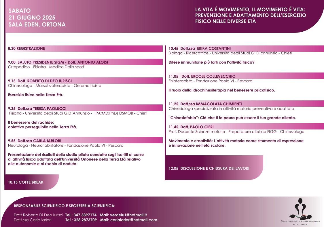 A curare il programma scientifico saranno il dottor Roberto Di Deo Iurisci, chinesiologo e massofisioterapista, responsabile scientifico dell’evento, e la dottoressa Carla Iarlori, neurologa e neuroriabilitatrice, coordinatrice della segreteria scientifica.