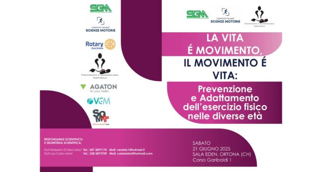 Salute, prevenzione e benessere a ogni età saranno i temi centrali del convegno scientifico-divulgativo intitolato "La vita è movimento, il movimento è vita: prevenzione e adattamento dell’esercizio fisico nelle diverse età", in programma sabato 21 giugno presso la Sala Eden di Ortona, in Corso Garibaldi 1, con inizio alle ore 8:30.