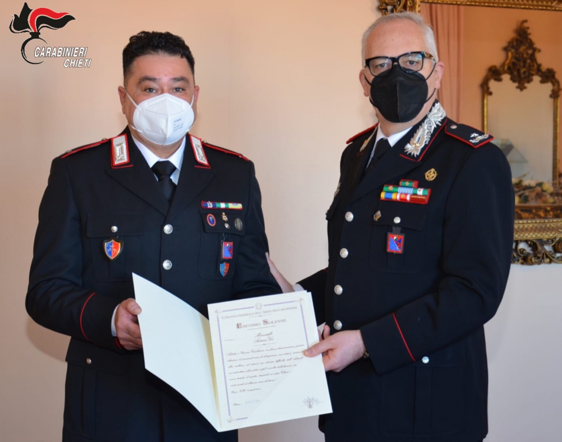 Nella scorsa mattinata presso la caserma “Pasquale Infelisi” di Chieti, sede del Comando Legione Carabinieri “Abruzzo e Molise”, il Comandante, Generale di Brigata Paolo Aceto, nel corso di una sobria cerimonia a causa delle restrizioni imposte dall’attuale pandemia, ha consegnato al Maresciallo Antonio Verì, in servizio presso la Stazione dei Carabinieri di Ortona, l’encomio solenne, come prima attestazione di merito, concesso dal Comandante Generale dell’Arma dei Carabinieri Generale di Corpo d’Armata Teo Luzi con la seguente motivazione: