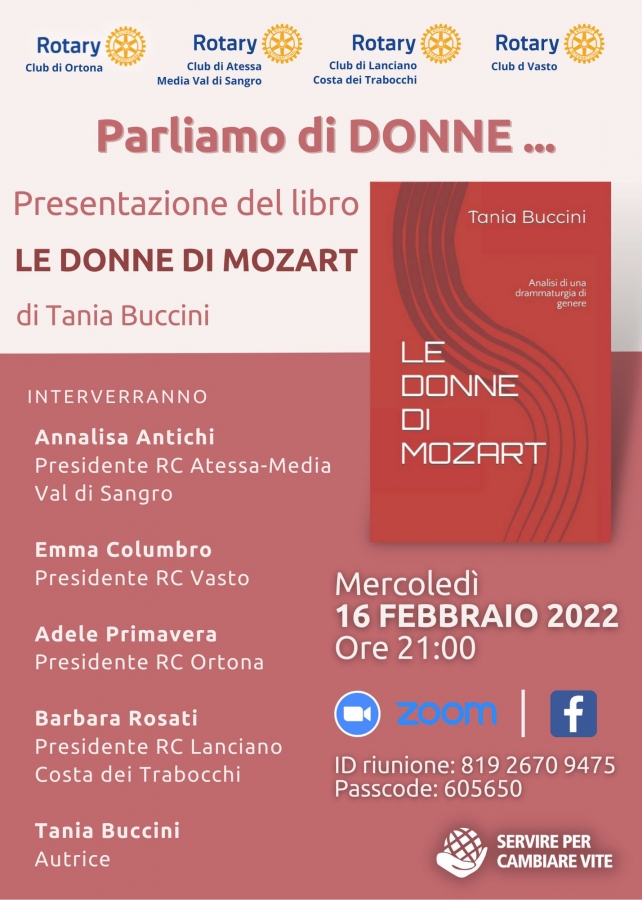 soprano, docente presso il Liceo Musicale “R. Mattioli” di Vasto presenta il suo libro “Le Donne di Mozart” in collaborazione con i Rotary Club di Ortona, Atessa Media Val di Sangro, Lanciano Costa dei Trabocchi e Vasto.