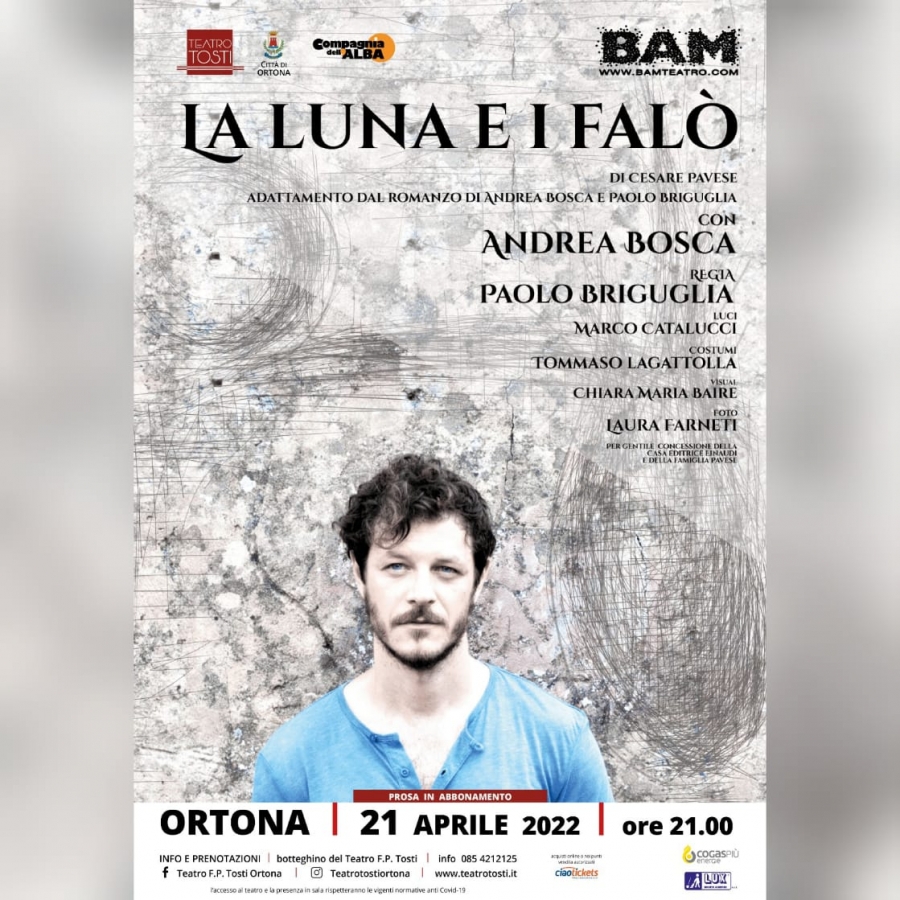 "La luna e i falò" è l'ultimo dei tre spettacoli in abbonamento che hanno composto il mini cartellone di prosa proposto dalla Compagnia dell'Alba, che dirige il Teatro Tosti, per i mesi di febbraio e maggio. L'appuntamento è per giovedì 21 aprile, alle ore 21.00. Il testo è tratto dall'ultimo romanzo di Pavese che riassume tutte le tematiche più care all'autore piemontese ed è considerato il suo capolavoro.