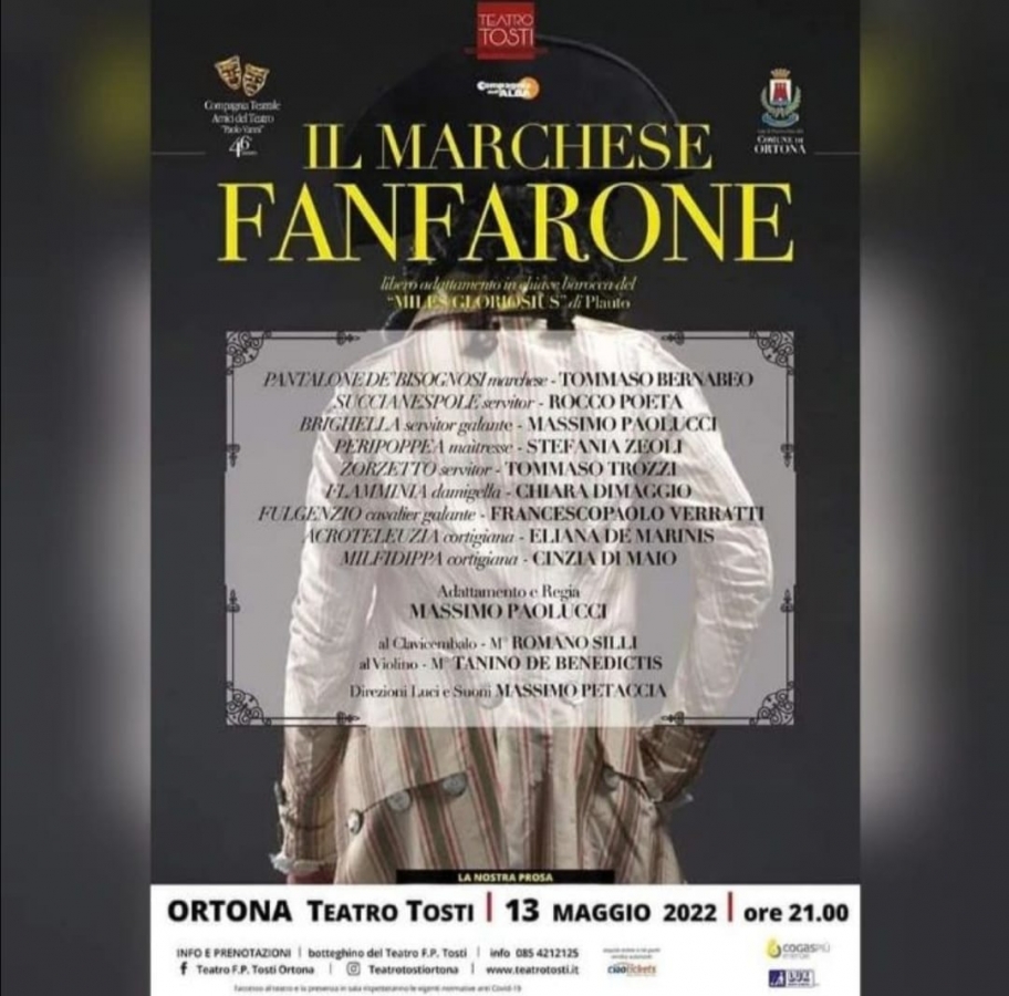 Venerdì 13 maggio 2022 - ore 21.00 in scena lo spettacolo IL MARCHESE FANFARONE della Compagnia Amici del Teatro libero adattamento in chiave barocca della commedia "Miles Gloriosius"di Plauto che narra di un soldato vanesio e fanfarone.