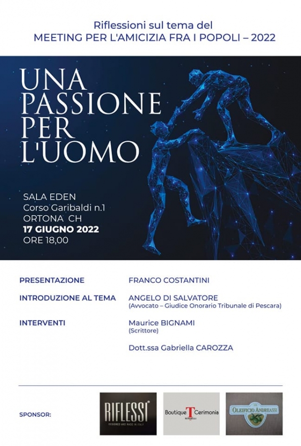 Prendendo lo spunto dal tema scelto quest'anno per il Meeting di Rimini per l'amicizia fra i popoli (Una passione per l'uomo) e nel dare seguito a un precedente convegno organizzato alcuni anni fa a Ortona con la presenza dello scrittore Maurice Bignami, gli amici dello scrittore hanno organizzato per il prossimo venerdì 17 giugno ore 18 presso la sala Eden di Ortona un nuovo incontro con lo stesso Maurice Bignami che illustrerà anche la sua ultima pubblicazione.