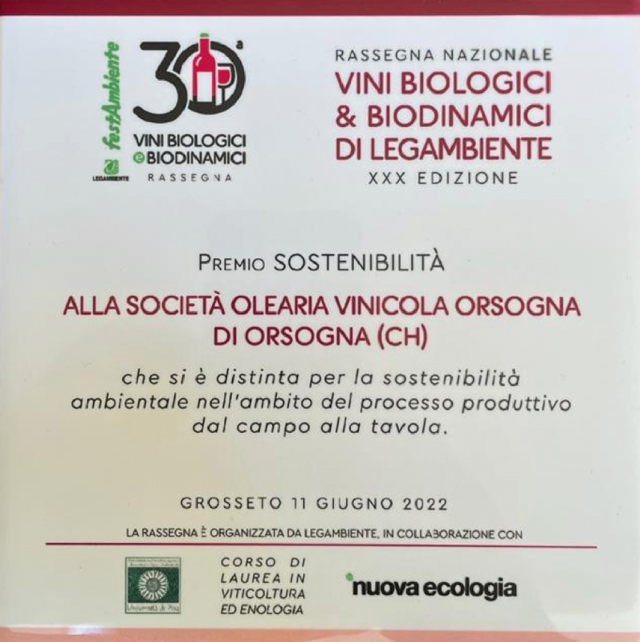 "È per me motivo di grande orgoglio – ha dichiarato Giuseppe Di Marco, presidente di Legambiente Abruzzo - aver partecipato alla premiazione e valorizzazione dei migliori vini biologici e biodinamici del Paese, che rappresentano preziose eccellenze per tutto il settore vitivinicolo italiano, a partire dalla Cantina di Orsogna premiata come riferimento per la Sostenibilità . Un'azienda bio-dinamica virtuosa che unisce la sensibilità ambientale alla valorizzazione dell'identità del territorio e alla conservazione della biodiversità ."
