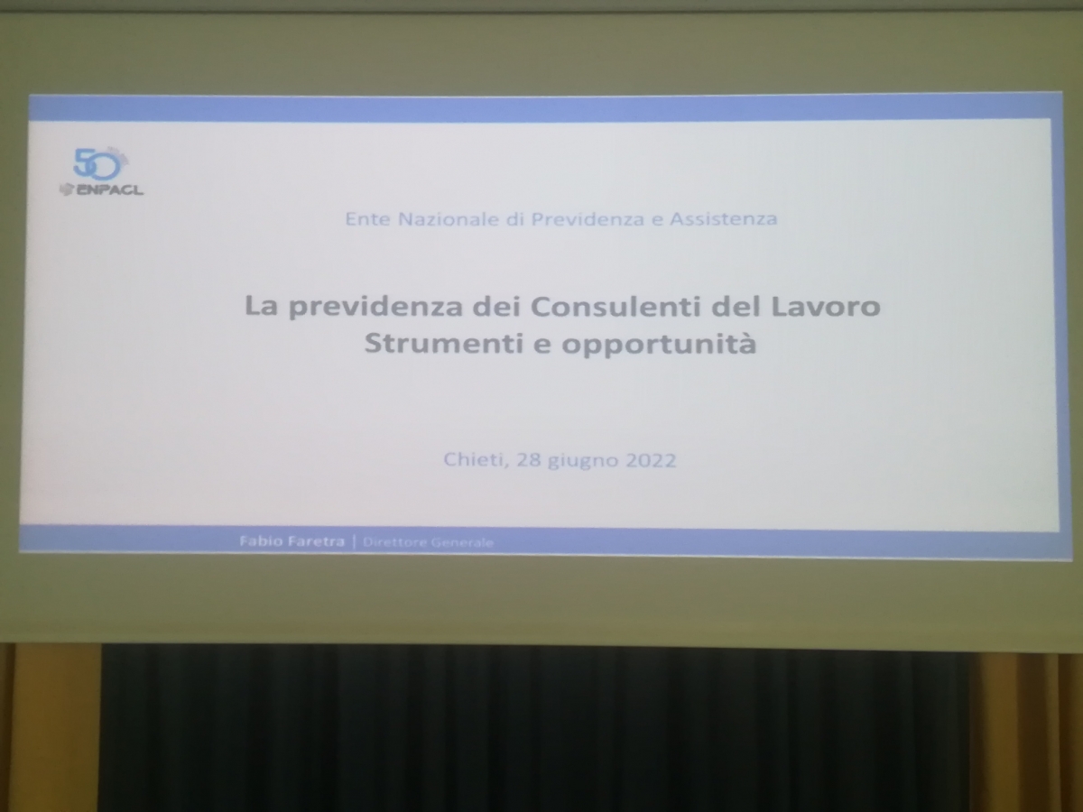 Ad accogliere il relatore dott. Fabio Faretra, direttore generale dell’ente previdenziale, il presidente dell’ordine dei consulenti del lavoro della provincia di Chieti Nicola De Laurentiis e il presidente provinciale dell’Associazione Nazionale Consulenti del Lavoro Marco Nestore.
