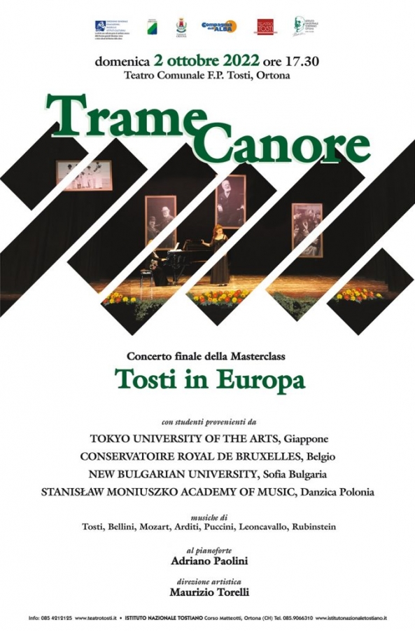 Trame canore è il progetto che fa incontrare il nostro Tosti con i ragazzi meritevoli di prestigiose istituzioni musicali internazionali. Il Maestro Maurizio Torelli ha avviato da tempo una serie di relazioni con numerosi enti per creare progetti ed occasioni che riportino al centro della formazione dei giovani musicisti italiani e stranieri il repertorio tostiano. Il progetto prevede quindi un periodo di formazione sulla vocalità e dei concerti conclusivi aperti al pubblico.