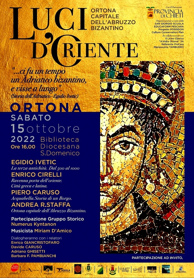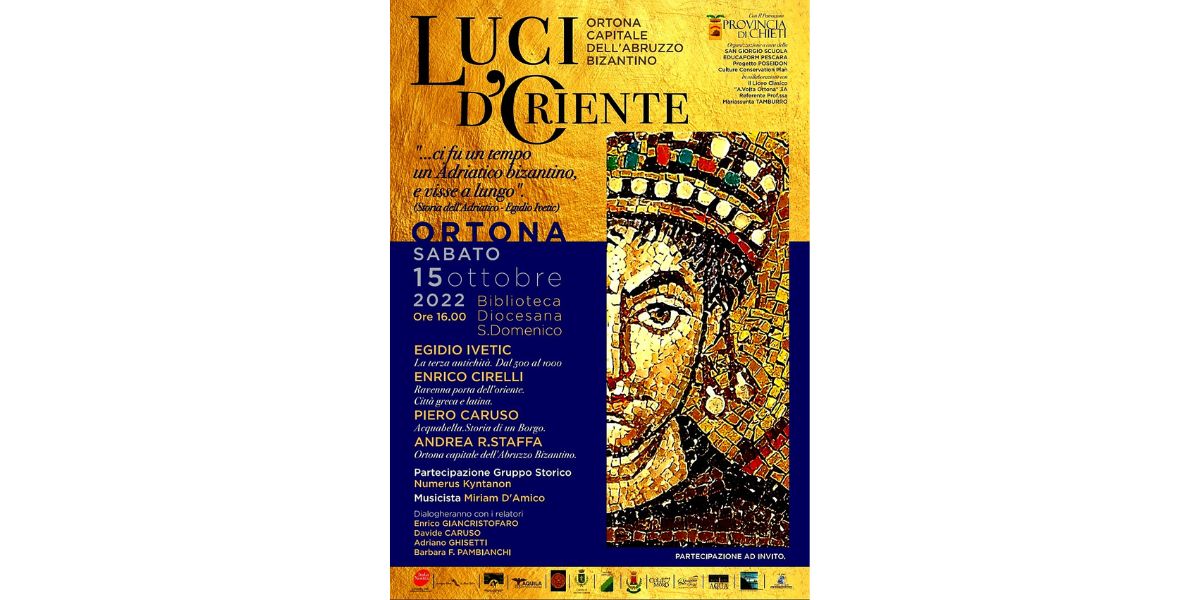 Sabato 15 ottobre, dalle ore 16 a Ortona nella biblioteca diocesana San Domenico (via Leone Acciaiuoli n.77) a Ortona, si parlerà dell'Abruzzo bizantino e di Ortona “ capitale dell'Abruzzo bizantino “
