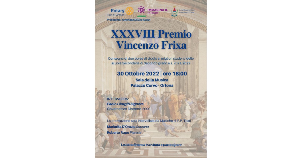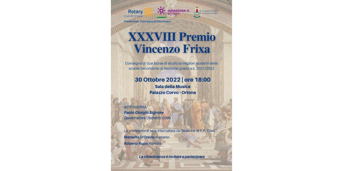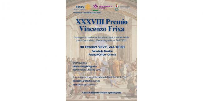 Domenica 30 ottobre, a partire dalle ore 18.00, il Rotary Club di Ortona terrà la Cerimonia di consegna del Premio “Vincenzo Frixa”, giunto alla sua XXXVIII edizione.
