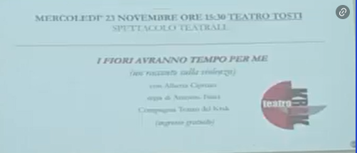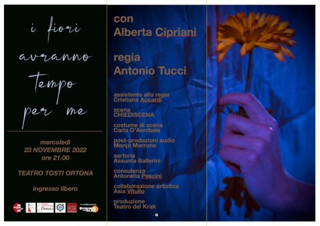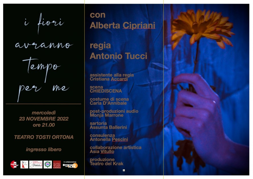 Mercoledì 23 alle ore 21.00 presso il Teatro Tosti di Ortona ci sarà il debutto dello spettacolo realizzato dal Teatro del Krak: “I fiori avranno tempo per me” con la regia di Antonio Tucci e l’attrice Alberta Cipriani.