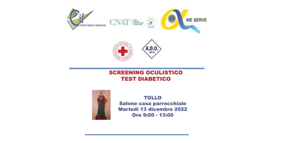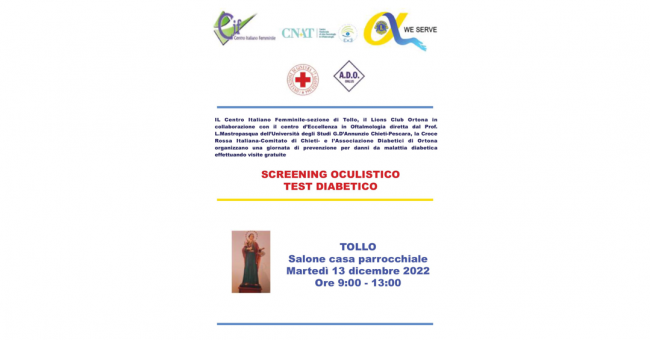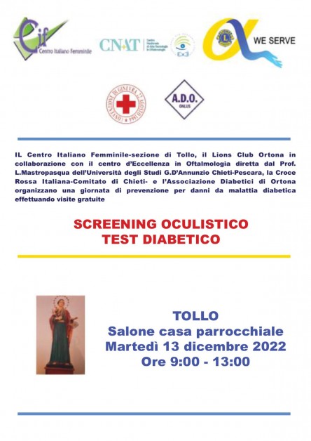 Il Centro Italiano Femminile-sezione di Tollo, il Lions Club di Ortona in collaborazione con il centro di Eccellenza in Oftalmologia diretta dal Prof. L. Mastropasqua dell’Università degli Studi G. d’Annunzio Chieti-Pescara, La Croce Rossa Italiana-Comitato di Chieti e L’associazione Diabetici di Ortona organizzano una giornata di prevenzione per danni da malattia diabetica effettuando visite gratuite.