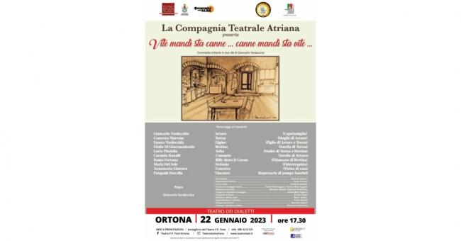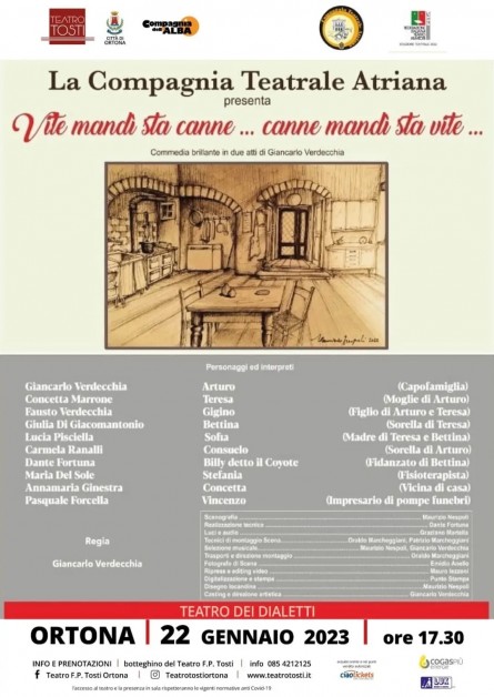 Al via la stagione del Teatro dei dialetti frutto della collaborazione tra la Compagnia dell'Alba, che dirige il Teatro Tosti, e la compagnia Amici della Ribalta di Lanciano. Domenica 22 gennaio, alle ore 17.30, sarà in scena lo spettacolo " Vite mandì 'sta cann canne mandì' 'sta vite" di Giancarlo Verdecchia della Compagnia Atriana. Grazie a questo sodalizio il Tosti dedicherà ampio spazio al Teatro dei Dialetti un momento per riscoprire testi della tradizione in lingua proposti da compagnie affermate. Si tratta, a tutti gli effetti, di una mini stagione, curata dagli Amici della Ribalta, presieduta da Ermanno Di Rocco, composta da quattro appuntamenti che si terranno tutti alla domenica pomeriggio alle 17.30. Il primo appuntamento era stato previsto per l'11 dicembre con lo spettacolo "Cara Moglia" di Mario Pupillo tratto da una raccolta di lettere di Emiliano Giancristofaro, proposto dagli Amici della Ribalta. Per un' indisposizione però di due attori della Compagnia lo spettacolo è stato rinviato a domenica 26 marzo sempre alle 17.30. I biglietti dunque acquistati per dicembre saranno validi per il nuovo appuntamento.