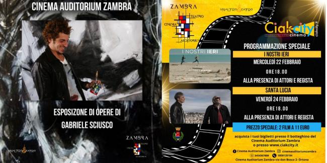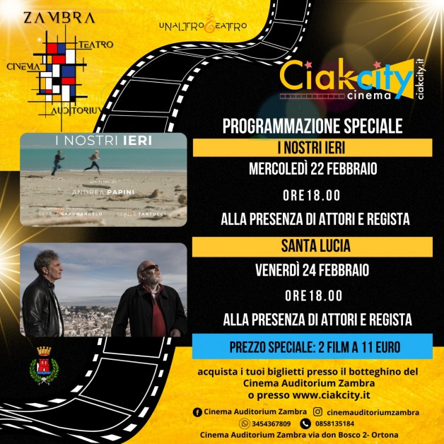 Il Cinema Auditorium Zambra di Ortona (Ch) sta per ospitare un doppio appuntamento con il cinema d'autore: in sala, saranno presenti in rappresentanza attori e registi dei due film scelti, per un confronto con il pubblico grazie all'impegno di Unaltroteatro di Lorenza Sorino, Arturo Scognamiglio e Davide Borgobello che in questo primo anno di gestione della struttura rimessa in sesto dal Comune di Ortona, sta offrendo tanti spunti culturali agli utenti oltre ad una programmazione cinematografica ampia in simbiosi con Ciakcity.
