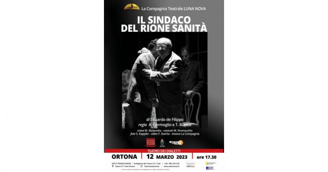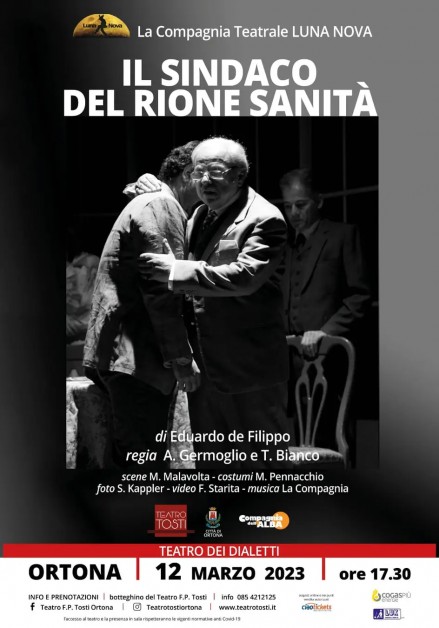 La rinnovata collaborazione tra la Compagnia dell'Alba, che dirige il Teatro Tosti, e la compagnia Amici della Ribalta di Lanciano, presieduta da Ermanno Di Rocco, ha riportato al Tosti il Teatro dei Dialetti. Una mini stagione curata dalla compagnia Amici della Ribalta e composta da quattro appuntamenti che ha riscosso finora un ottimo successo. Il terzo appuntamento si terrà domenica 12 marzo, alle 17 30, al Teatro Tosti con Il sindaco del rione sanità di Eduardo De Filippo, messo in scena dalla Compagnia La Luna Nuova.