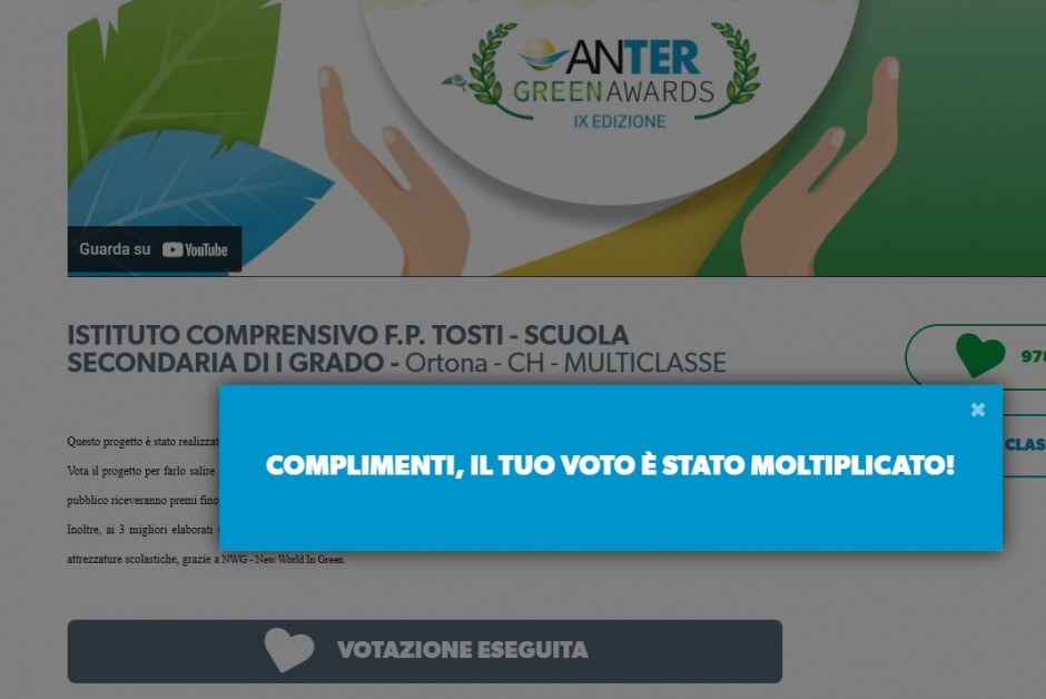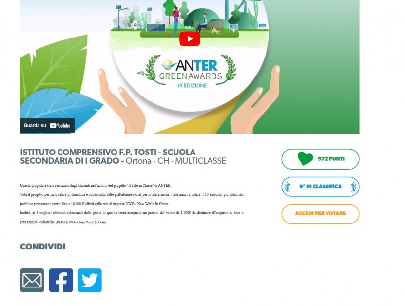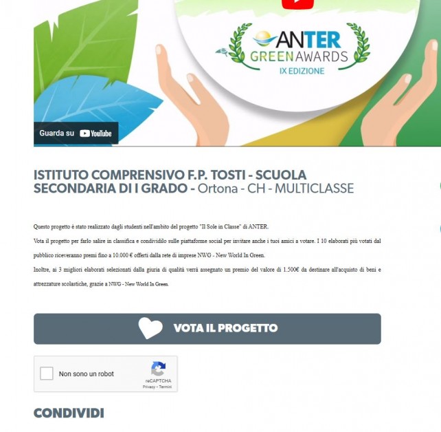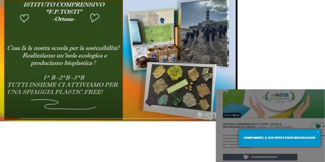 L' Istituto Comprensivo “F.P. Tosti” di Ortona partecipa, unica in Abruzzo, all’Anter Green Awards IX edizione , dove vince chi prende più voti. Si vota sul sito della Anter e tutti possono votare entro il 4 maggio .