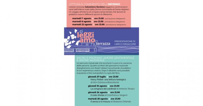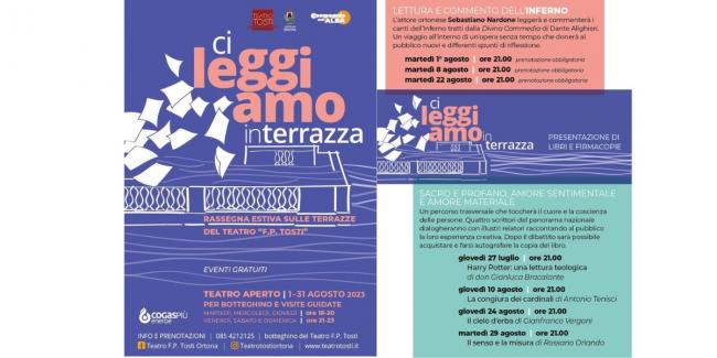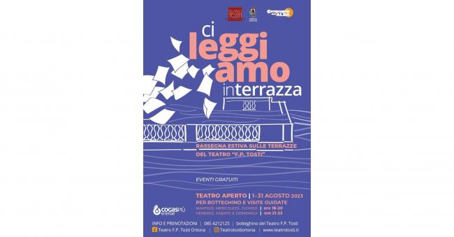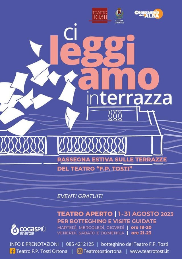 Dopo il successo della formula “Assaggi in terrazza”, la Compagnia dell’Alba, che dirige il Teatro Tosti, promuove un nuovo contenitore di appuntamenti gratuiti dedicati alla letteratura dal tema “Ci leggiamo in terrazza”. Gli incontri si terranno , infatti, proprio sulle terrazze del Teatro che faranno da cornice agli incontri.