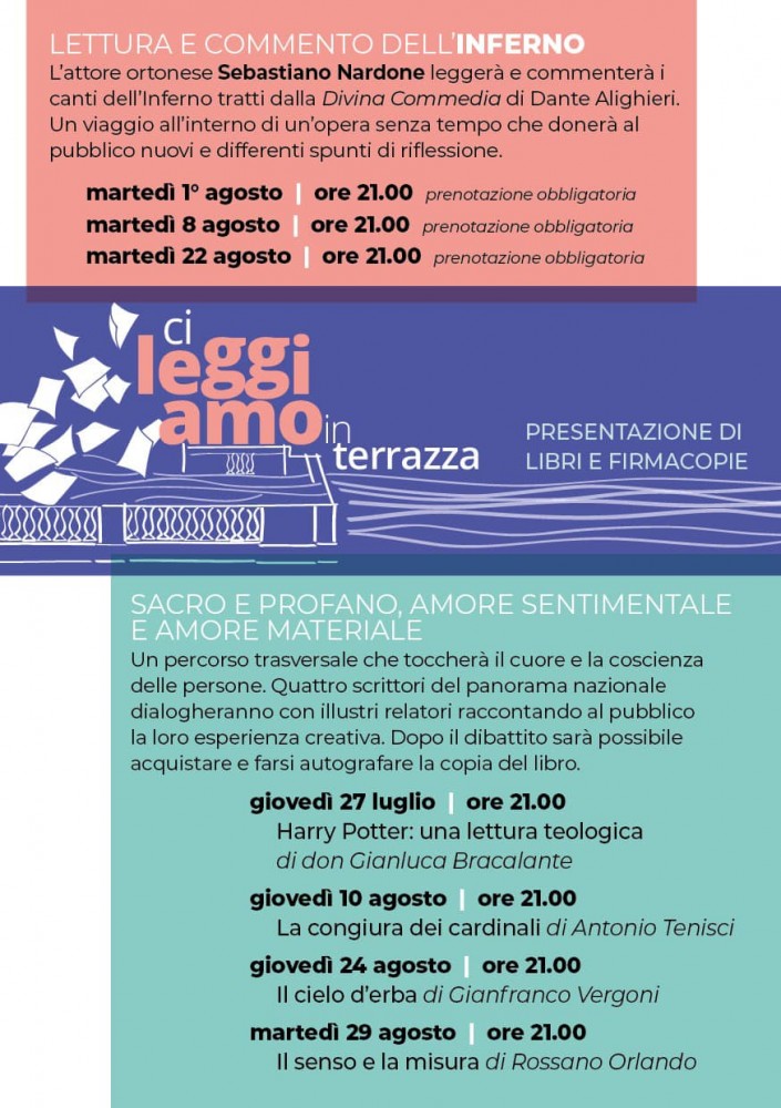 La prima proposta è quella della “Lettura e commento dell’Inferno”. La Divina Commedia sarà proposta agli spettatori attraverso il racconto e il commento dell’ attore ortonese Sebastiano Nardone. Gli appuntamenti sono fissati per il martedì del mese di agosto, 1 / 8 / 22, alle ore 21.00. Ingresso gratuito con prenotazione obbligatoria al botteghino del teatro.
