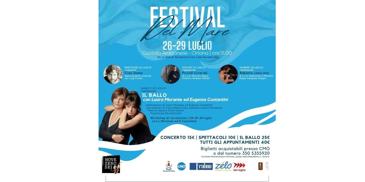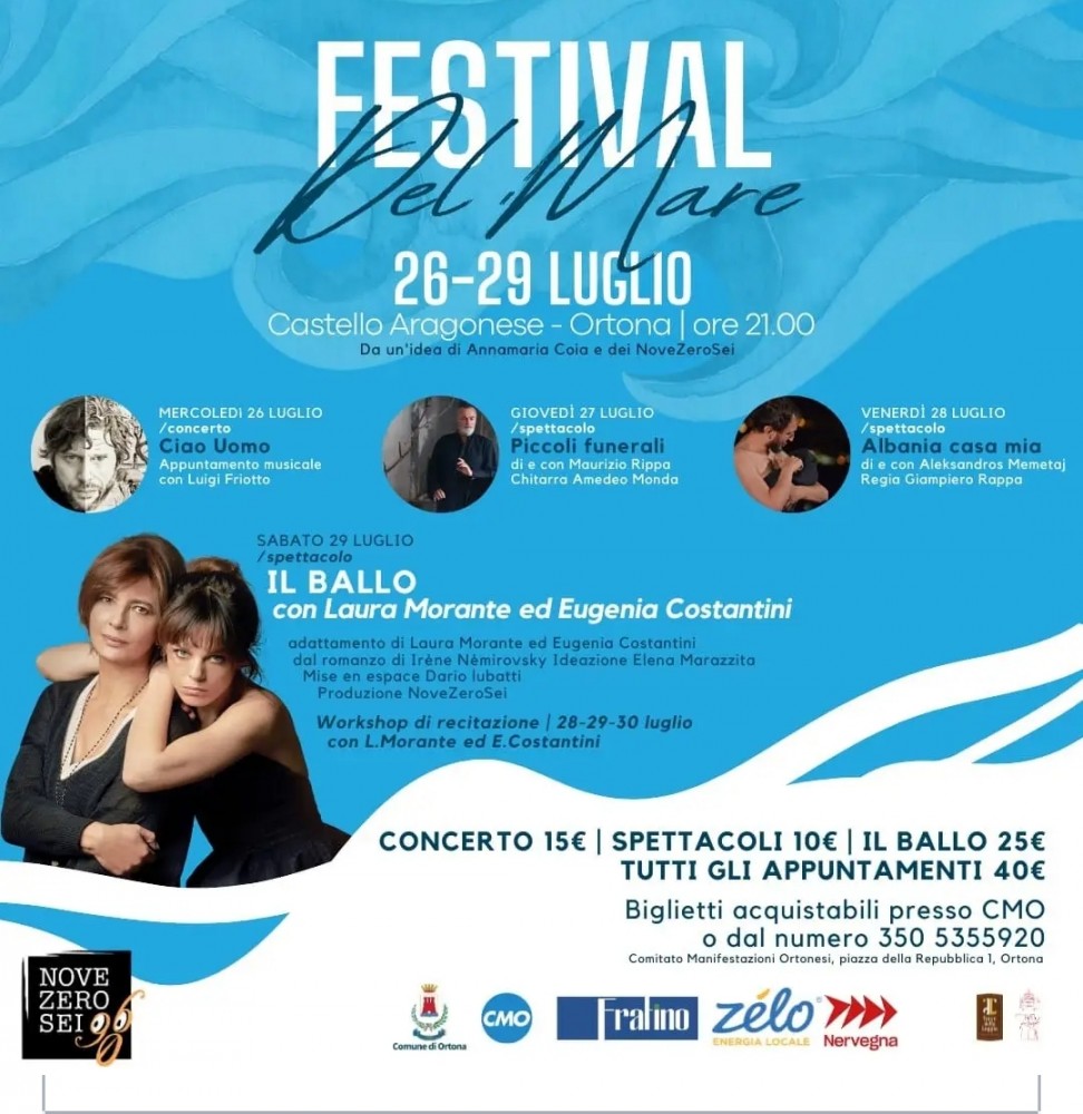 Il "Festival del mare", ideato dalla Compagnia teatrale NoveZeroSei – APS, nasce con l'obiettivo di valorizzare il patrimonio culturale e territoriale attraverso l'arte performante teatrale. L'evento è stato presentato nella mattinata di ieri nella cornice di Torre della Loggia alla presenza degli organizzatori e del vice sindaco Cristiana Canosa. Il Festival del mare si svolgerà in quattro giorni, dal mercoledì al sabato, nelle aree all'interno e adiacenti al Castello aragonese. Il programma si compone di tre spettacoli di compagnie teatrali dirette da grandi nomi del teatro italiano, mentre l'ultimo evento sarà una produzione della Compagnia teatrale NoveZeroSei-APS che coinvolgerà due grandi nomi del panorama teatrale e cinematografico italiano ovvero Laura Morante ed Eugenia Costantini. La direzione artistica è di Dario Iubatti, gli organizzatori sono Tommaso Bernabeo , Annamaria Coia, Eliana De Marinis.