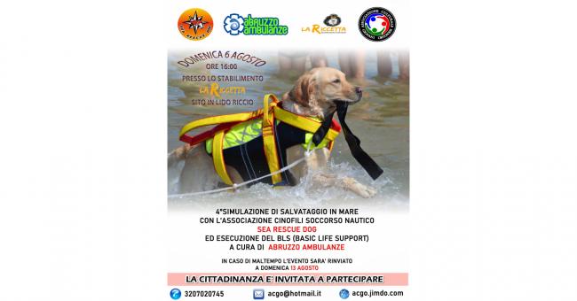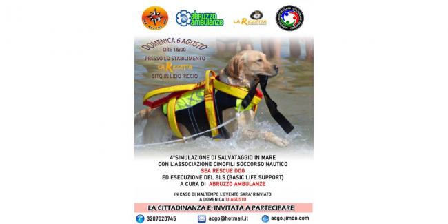 Giunta alla quarta edizione, l'Associazione Culturale Giovani Ortonesi – Presidente Claudio Di Lizio - vi invita il giorno 6 Agosto 2023, presso lo Stabilimento balneare "La Riccetta" sito in Lido Riccio, dalle ore 16:00, ad una simulazione di salvataggio in mare con l'Associazione Cinofili Soccorso Nautico SEA RESCUE DOG – Presidente Fabrizio Calgione - con recupero dell'annegato e trasporto sulla battigia con verifica delle condizioni del paziente da parte del medico autorizzato.