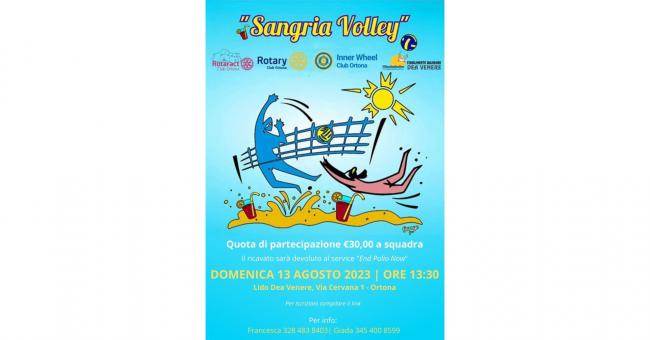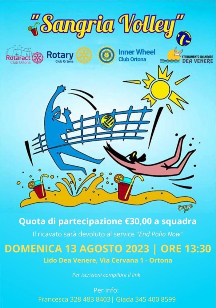 Torna con l’ormai consueto appuntamento estivo il “Sangria Volley”, l’evento realizzato dal Rotaract di Ortona, in collaborazione con il Rotary Club di Ortona e l’Inner Wheel, per raccogliere fondi per il service “End Polio Now”, per eradicare completamente la poliomielite da quei paesi che ne sono ancora colpiti. Appuntamento domani, 13 Agosto, presso il Lido Dea Venere a partire dalle 14, per trascorrere un pomeriggio all’insegna del Service, di tanta allegria e tanta buona sangria!