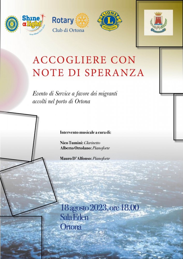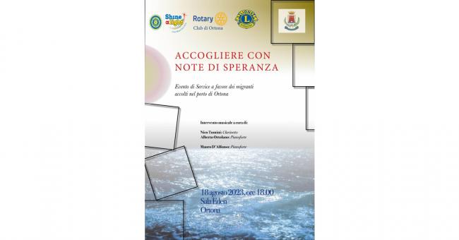 Si svolgerà venerdì 18 agosto, a partire dalle ore 18.00, una cerimonia di consegna alle autorità comunali, da parte dei club di service della città di Ortona (Rotary, Lions e Inner Wheel ) di calzature per uomo, donna e bambino, da destinare ai migranti che verranno accolti sistematicamente nel porto di Ortona.
