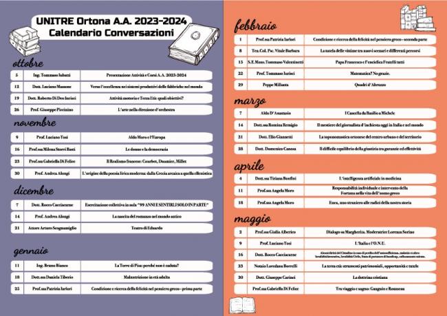 Una data nota, quella del 5 ottobre, che era stata, infatti, annunciata fin dalla festa di fine anno svoltasi sabato 10 giugno al Cinema Teatro Zambra. Un programma delle conversazioni di per sé ricco quello dell'anno accademico 2023-2024, con relatori che sono le eccellenze del territorio, un'offerta però che è destinata ad ampliarsi con i corsi che verranno proposti agli iscritti.