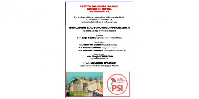 I Partito Socialista Italiano - sezione di Ortona – organizza un incontro, che si terrà il 9 novembre 2023 alle ore 17,00 nei locali della sala eden di ortona sul tema “ istruzione e autonomia differenziata - tra formazione e crescita sociale “
