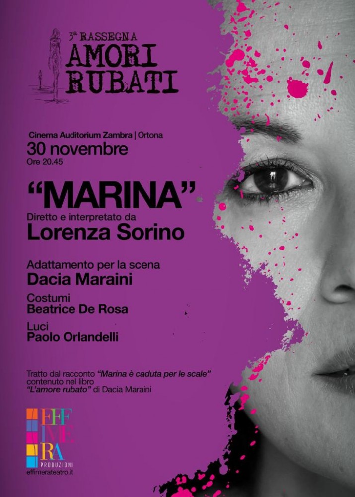 Il progetto di Effimera approda il 30 novembre alle 20.45 presso il Cinema Auditorium Zambra di Ortona (CH) gestito da Unaltroteatro di Arturo Scognamiglio e Lorenza Sorino con lo spettacolo di quest'ultima e facente parte del progetto "Marina", tratto dal racconto Marina è caduta per le scale di Dacia Maraini.