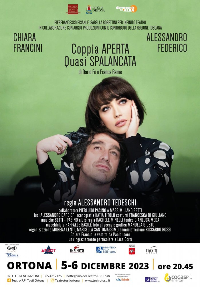 Terzo appuntamento con la stagione di prosa, dopo il grande successo ottenuto nelle due serate da Andrea Pennacchi conosciuto ai più come “Il poiana”, è attesa il 5 e il 6 dicembre, al Teatro Tosti, alle 20.45, la poliedrica Chiara Francini con lo spettacolo “Coppia aperta quasi spalancata” di Dario Fo e Franca Rame.